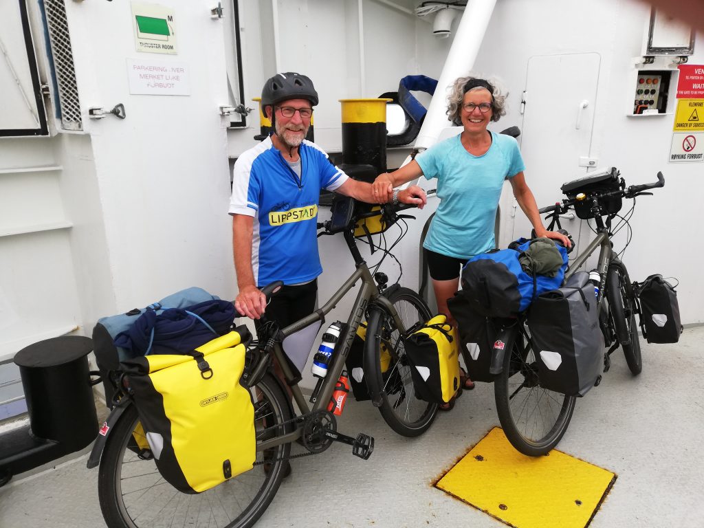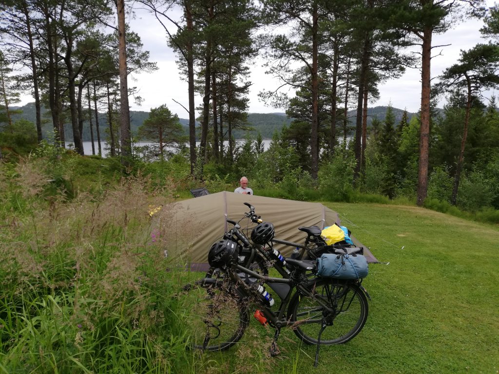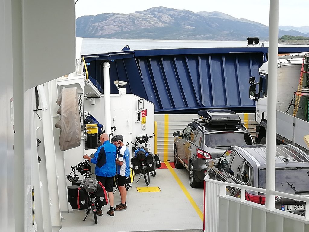We rollen de laatste helling af zo de veerboot op naar Hofles, dat is meer geluk dan wijsheid. Aan boord ontmoeten we onze Duitse vriend weer die we gisteren onderweg tegenkwamen. We volgen dezelfde route maar nemen ’s ochtends afscheid om elkaar dan in de loop van de middag weer tegen te komen op de volgende camping. Vaste prik om dan de dag te evalueren waarbij vooral de hoogtepunten, lees hoogtemeters, worden besproken. De fietsers die we tegenkomen vinden het zonder uitzondering pittig, zelfs de jongeman uit Ulm met zijn gravelbike en minimale bepakking.