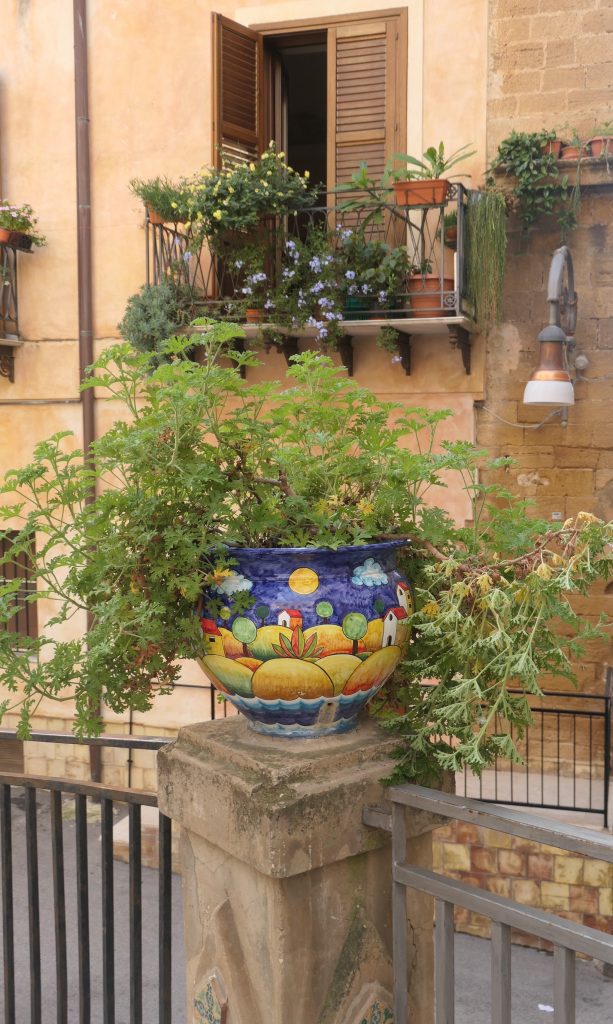Na een trage klim van twintig kilometer wacht in Caltagirone een laatste uitdaging om via steile straatjes en trappen bij onze bestemming uit te komen. Een garage voor de fietsen en een warme douche maakt de kleine ongemakken weer snel goed. Voor de garage wordt de familie ingeschakeld, vader komt over een uur en ondertussen houdt Luigi buiten een oogje op onze fietsen die op straat staan.