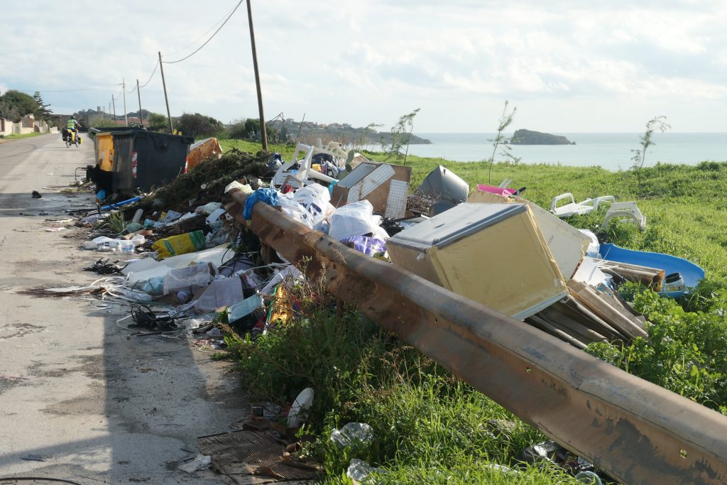 Van Trapani fietsen we naar Mazara langs de kust over stille olijfweggetjes met de onvermijdelijke rommel.