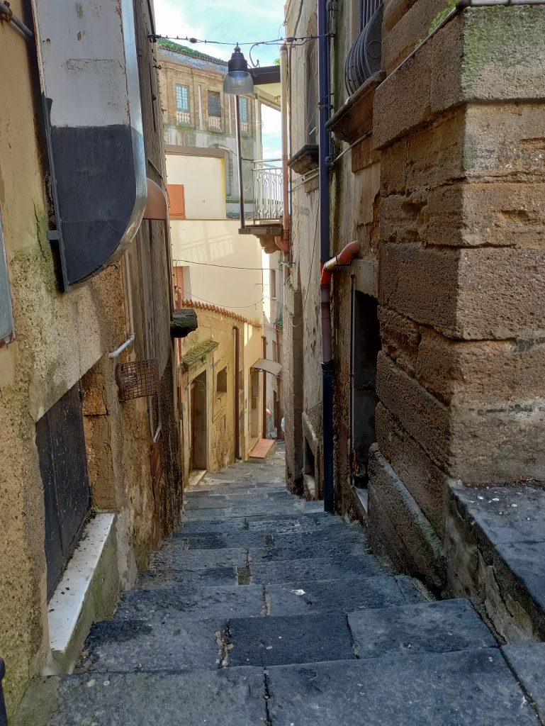 De plaatsen met mooie historische stadskernen die we tegenkomen zijn bijna allemaal op een berg gebouwd. Dat betekent wel een extra hindernis naast de smalle straten en het eenrichtingsverkeer. Steile hellingen en trappen overbruggen het hoogteverschil. Wij trappen peentjes zwetend omhoog of lopen zwetend met fietsen en bagage trappen op en af. Gelukkig hebben we na al die kilometers een prima conditie opgebouwd.