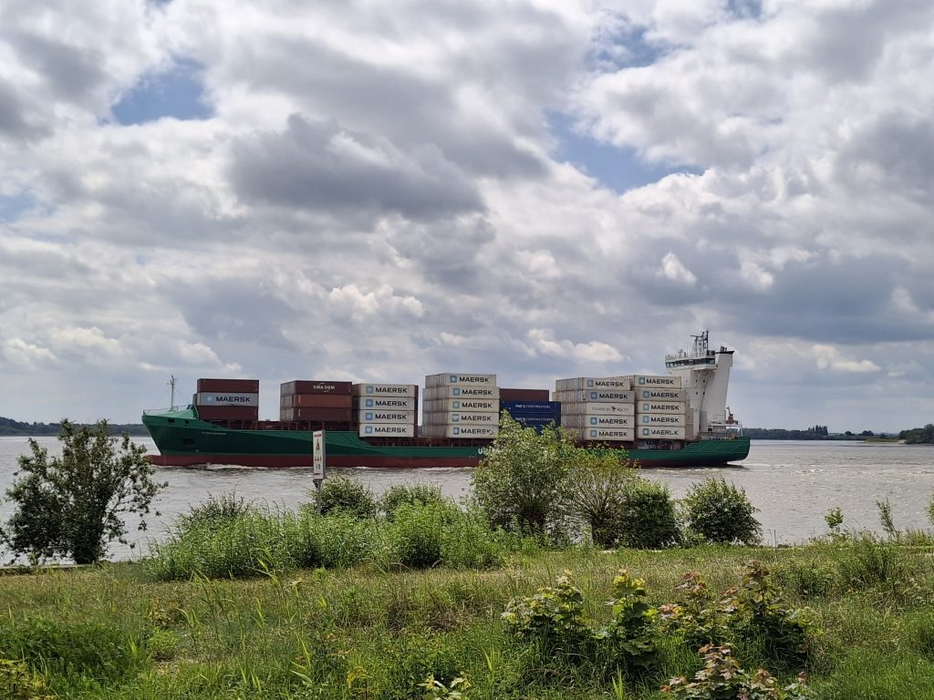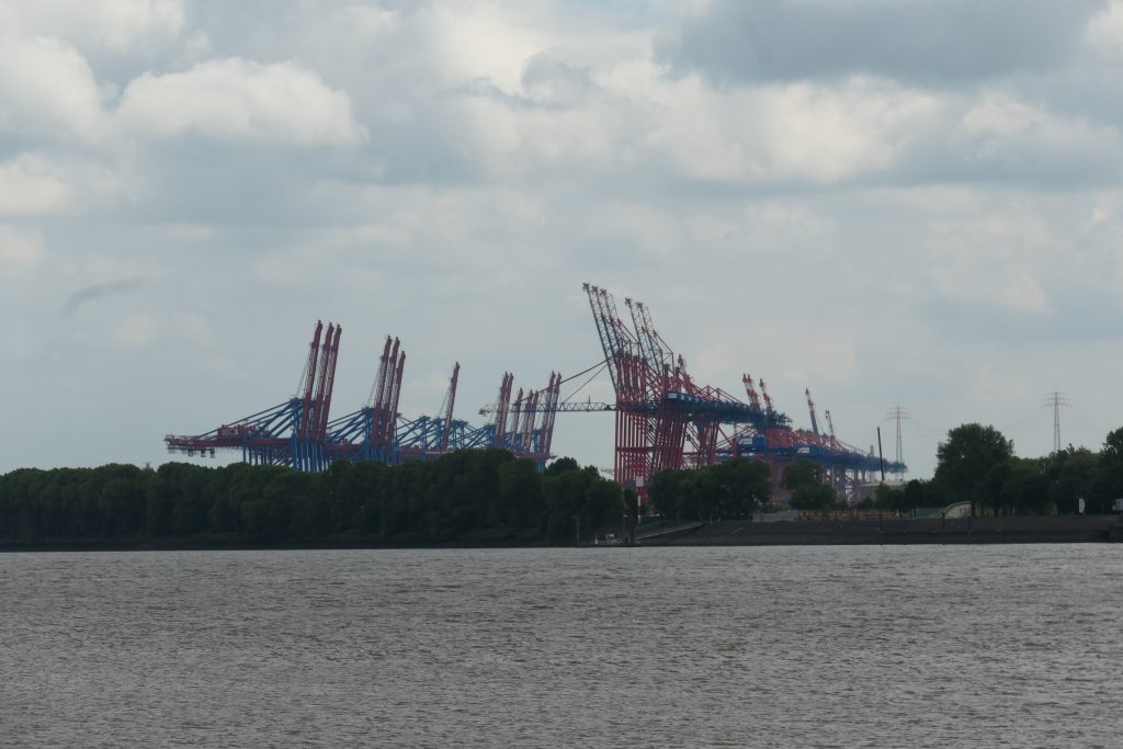 We vermaken ons de rest van de middag met kijken naar alle reuring. Heel bijzonder is het om vanuit je tentje, het kleine strand of terras gigantische containerschepen en cruiseschepen pal voor je neus op de Elbe voorbij te zien varen.