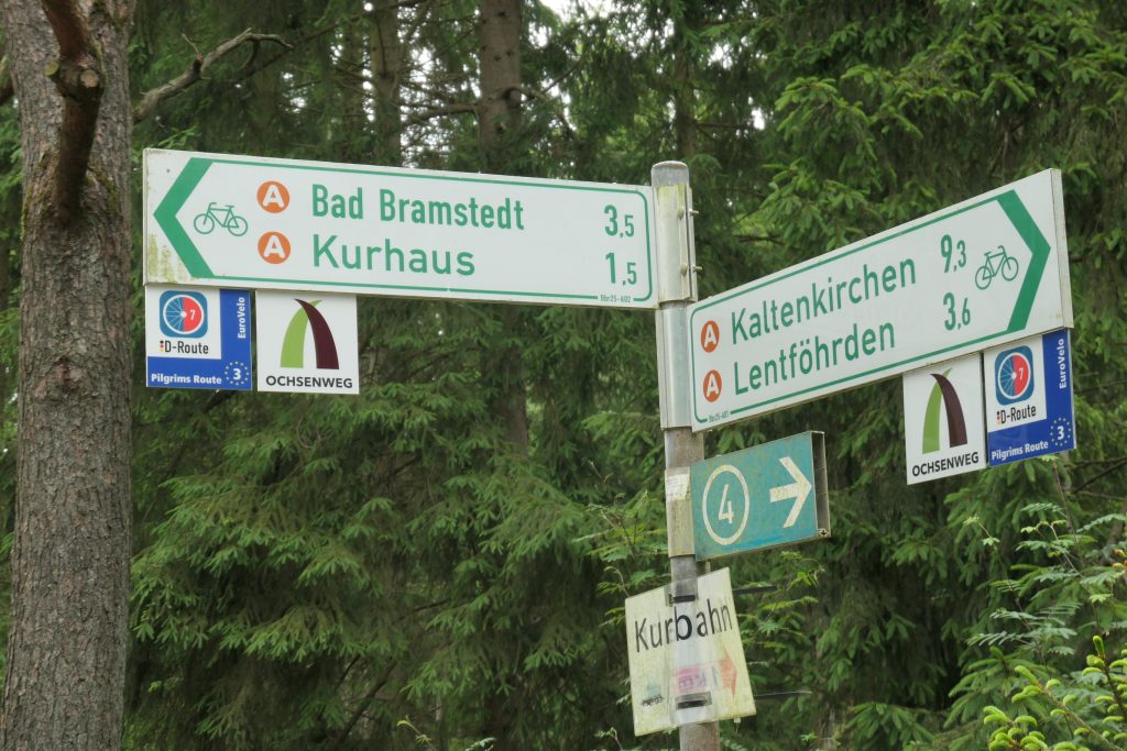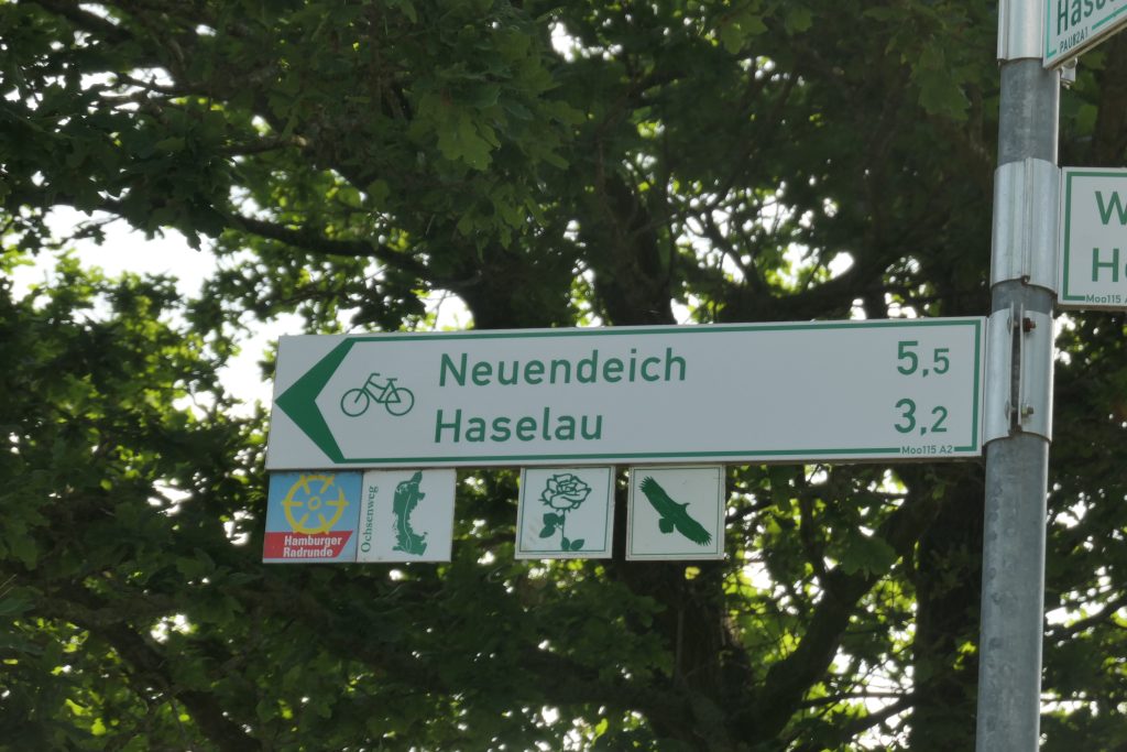 Vanaf Hamburg wordt de Eurovelo 3 als ‘Ochsenweg‘ aangegeven. Verschillende keren proberen de wegwijzers ons van de wijs te brengen door wisselende symbolen op de bordjes te gebruiken. Daar trapt team Fietsvirus niet in en we trappen keurig volgens de route kilometers weg op de pedalen.
