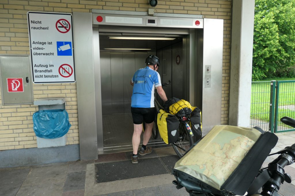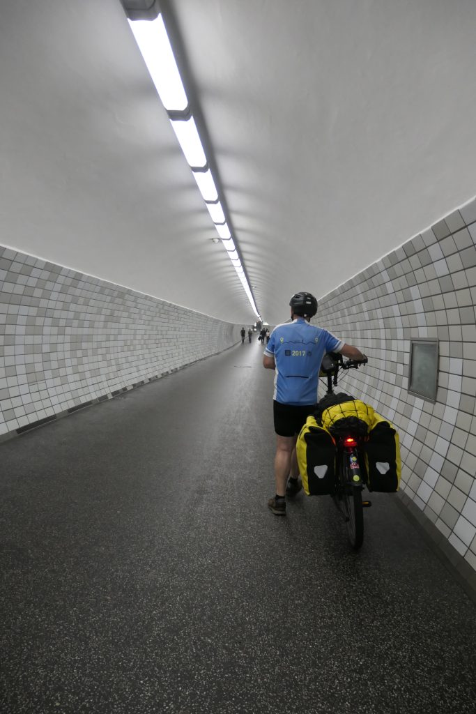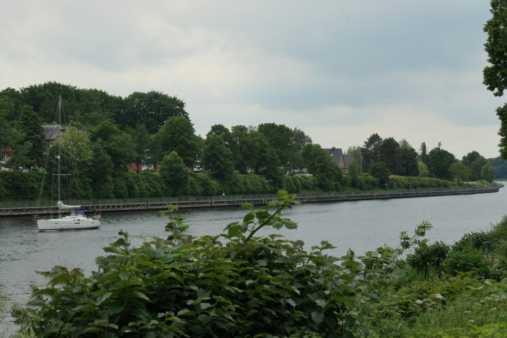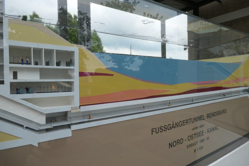 In Rendsburg gaan we in een tunnel onder het Nord- Ostsee Kanal door. In de lift naar beneden en aan de overzijde weer omhoog is een kabbelend geluid van water te horen. Is dit echt of voor de beleving? We kijken elkaar aan en besluiten dat het om de beleving moet gaan. Daar voelen we ons in ieder geval veiliger bij.