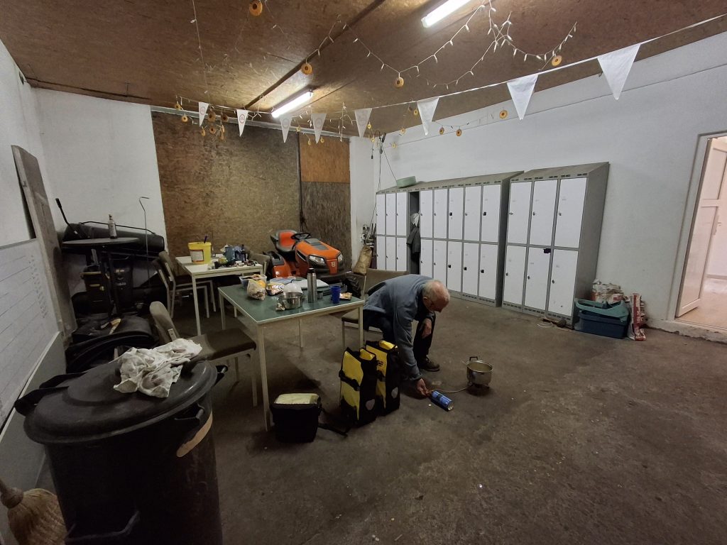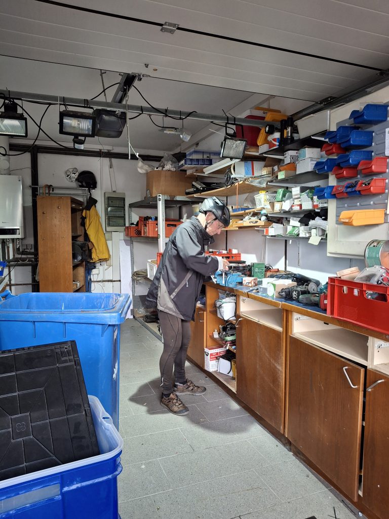Op de valreep maakt Ties voor vertrek nog snel gebruik van de werkplaats van het hotel. Het onderhoudsmannetje wil zijn gereedschap en werkbank wel even aan hem uitlenen om de bramen van de aluminium reserve buizen weg te vijlen.