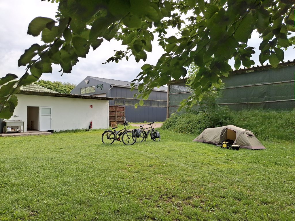 Het wordt dus hier overnachten. Eindelijk ook weer eens een camping met vooral kleine tenten van fietsers of stadsbezoekers. De fietsers ploegen met hun fietsen door het Elbe zand om een plekje te zoeken. De stadsbezoekers doen verwoede pogingen hun rolkoffertje door het zand te helpen. Powerbank en opblaasmatje versus elektrische tandenborstel en luchtmatras met elektrische pomp.