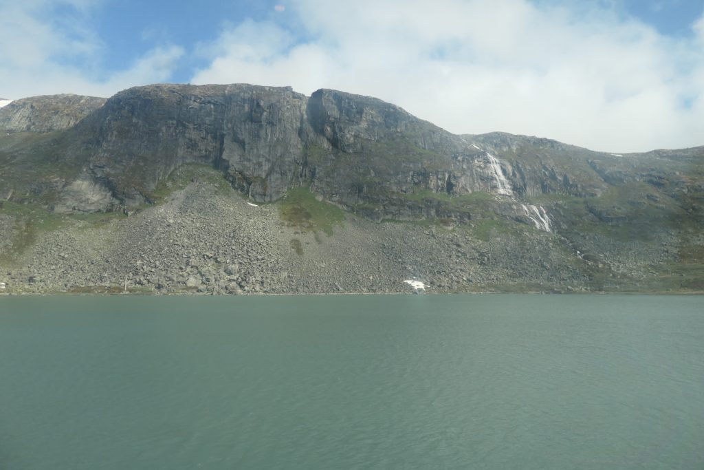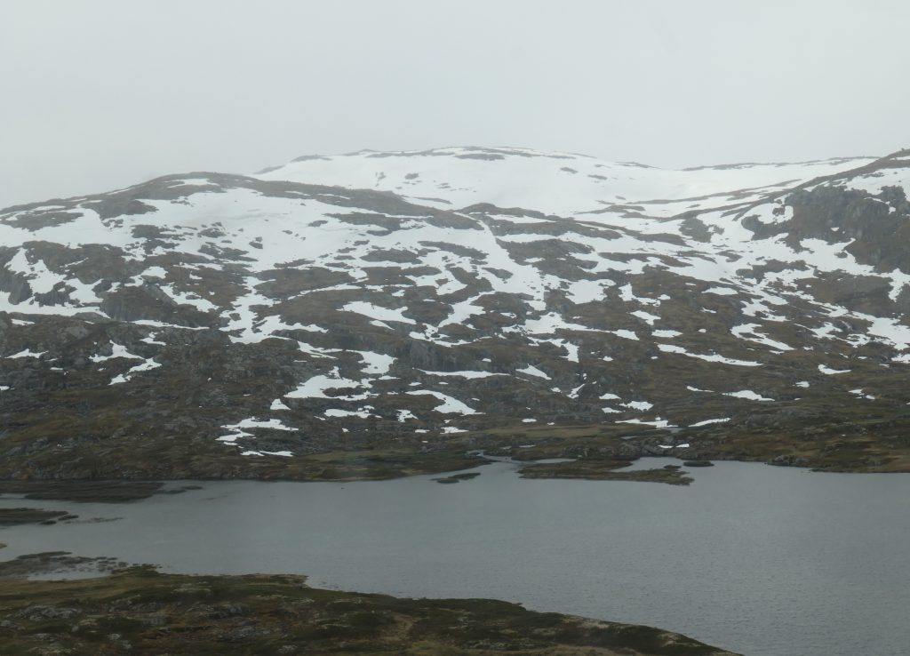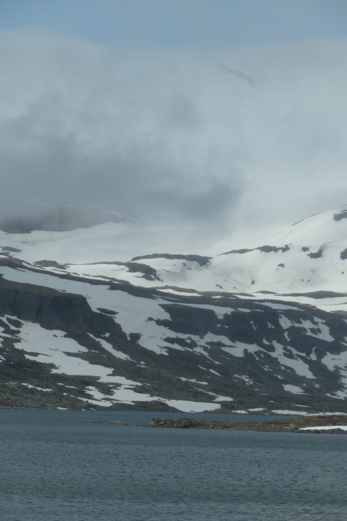 Klokslag half acht staan we op perron drie voor de trein naar Gol samen met héél véél andere vakantiegangers. De fietsen hangen keurig in de fietswagon aan de kapstok, wij hangen achterover geleund in de comfortabele treinstoelen. Het landschap laten we voorbij glijden, van 0 meter naar 1220 meter boven zeeniveau zonder een centje pijn. Er ligt nog veel sneeuw in het gebied bij de hoogste treinstations.
