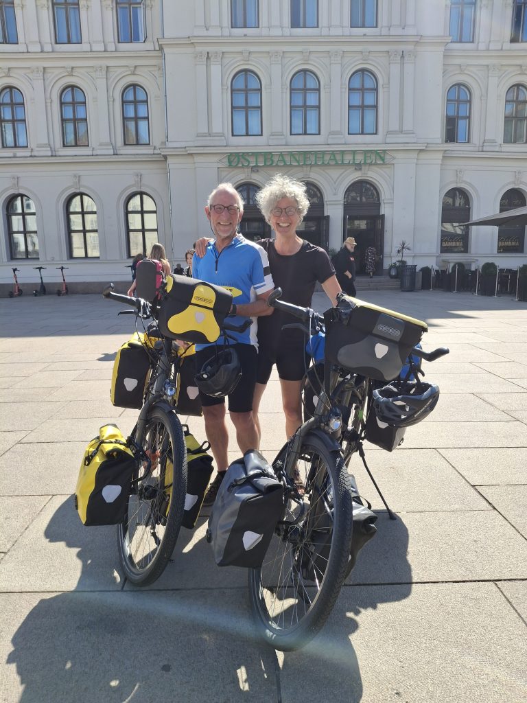 “Helaas geen plaats in de herberg“. De dag begint veelbelovend, blauwe lucht, geen wolk te zien, zon en wind in de rug! Ondanks dat we slechts vijftig kilometer van Oslo zijn verwijderd kiezen we voor de trein. Vijftig kilometer fietsen tussen bebouwing, industrie en slingeren langs de snelweg ziet er niet aantrekkelijk uit. In Drammen vertrekt ieder kwartier een trein naar Oslo. Gewoon instappen met de fietsen en in de trein de kaartjes kopen. Hoe gemakkelijk kan het gaan! Een zonnig Oslo ligt op ons al op te wachten. De stad ligt om een fjord gevouwen, het centrum beneden aan het water, de rest tegen de bergen geplakt. Eerst tijd vooor koffie en dan door naar de camping, natuurlijk bergop, maar dan heb je ook een geweldig uitzicht over de stad.